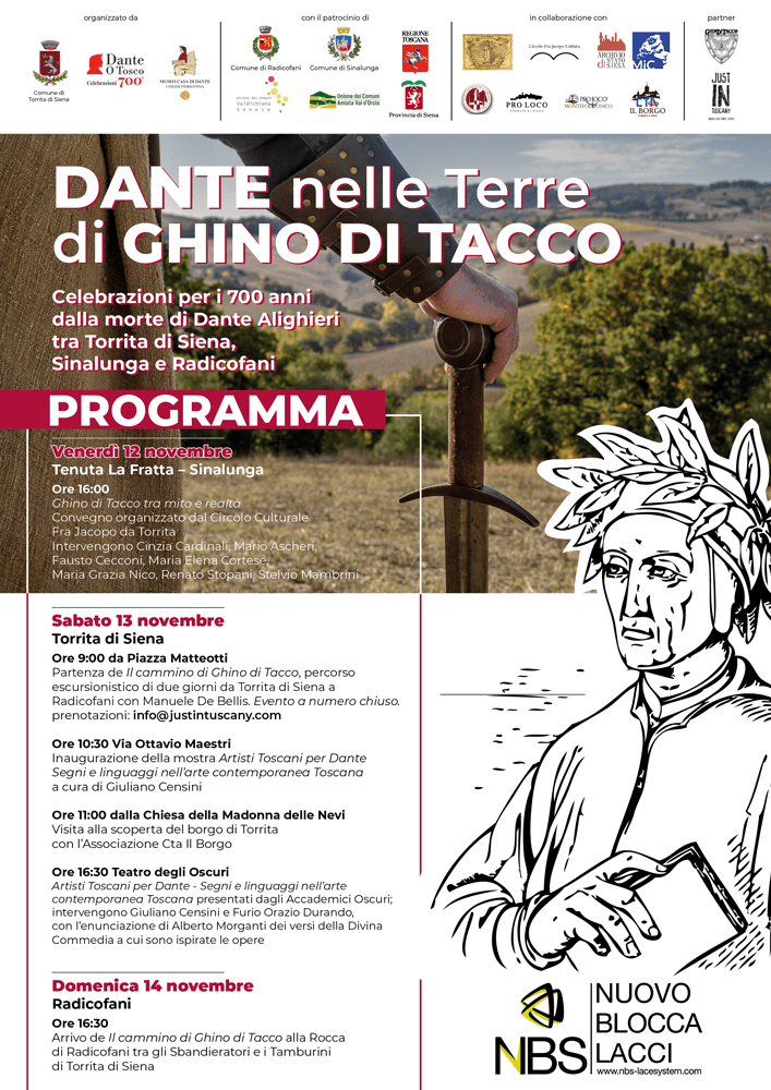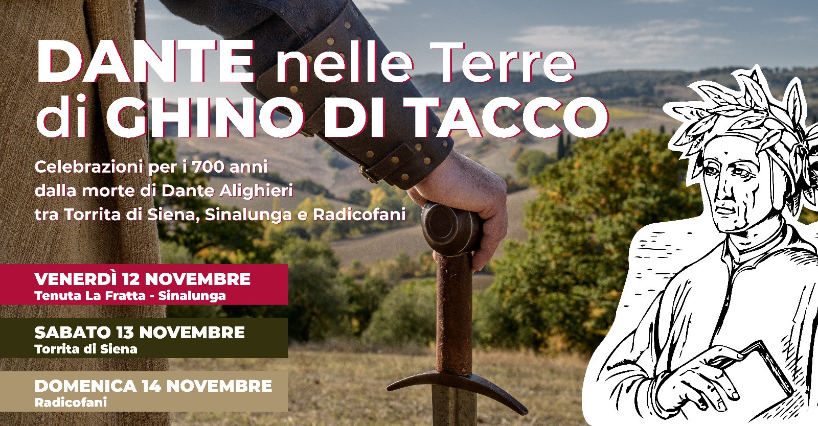 La ricorrenza del 700esimo anniversario della morte di Dante Alighieri a Torrita di Siena si realizza con un programma di eventi che si estende per tre giorni, e coinvolge anche i Comuni di Sinalunga e Radicofani. L’iniziativa, organizzata dal Comune di Torrita di Siena con la collaborazione delle associazioni culturali locali, si svolge dal 12 al 14 novembre e ha come titolo “Dante nelle Terre di Ghino di Tacco”. A fare da filo conduttore ai vari appuntamenti, è infatti proprio Ghino di Tacco, che visse nella seconda metà del XIII secolo nel territorio di Torrita, Sinalunga e Radicofani, e fu citato dal sommo poeta nel Canto VI del Purgatorio.